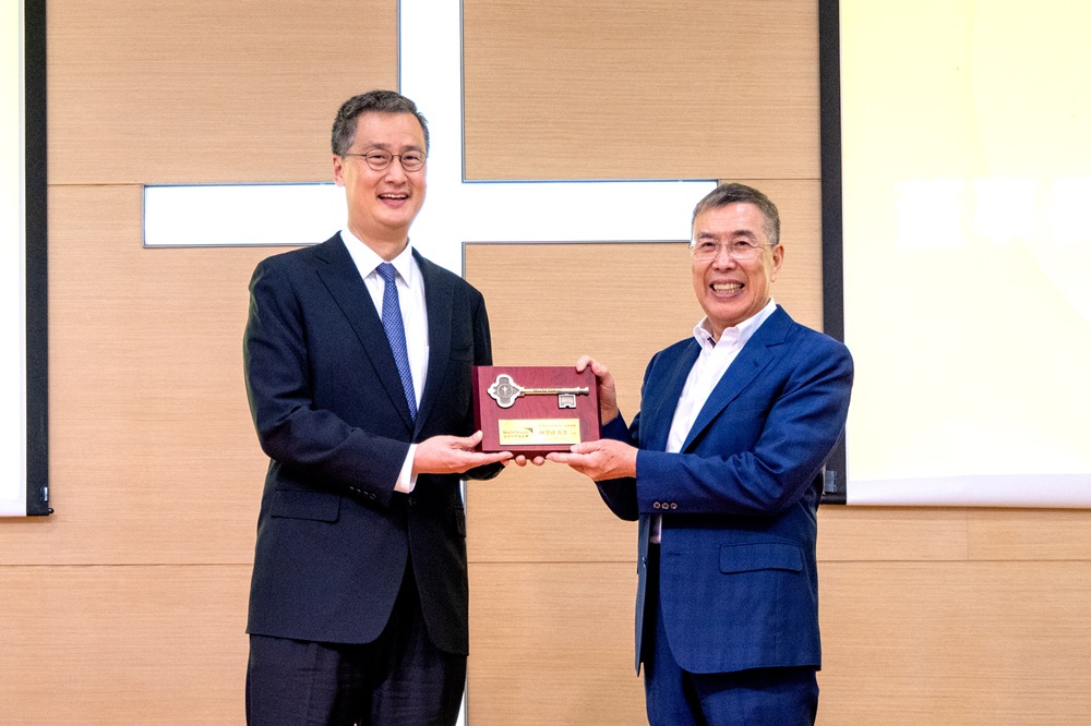 第20屆董事長丁廣欽(左)將象徵服務使命的信物「展望未來鑰匙」交棒第21屆董事代表林啓峰(右),要繼續為最有需要的兒童與家庭打開盼望的門。