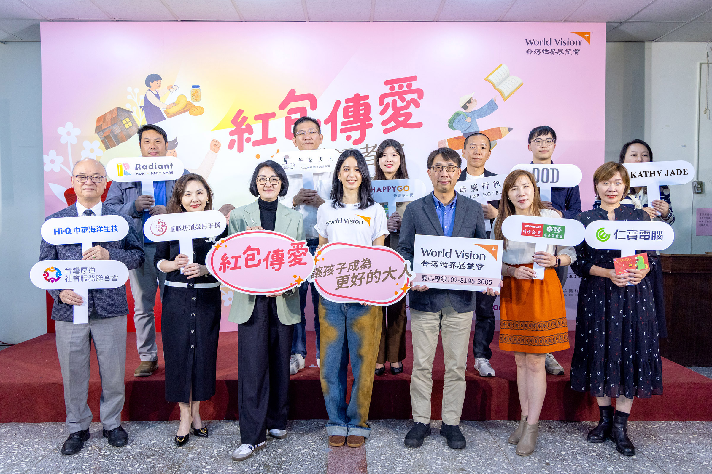台灣世界展望會感謝善心企業支持「紅包傳愛」,包括(順序按筆劃排列):HAPPY GO 鼎鼎聯合行銷、Hi-Q中華海洋生技、Kathy Jade、小熊森林花藝設計、川方企業與寶春慈善基金會、仁寶電腦、午茶夫人、弘塑科技股份有限公司、玉膳坊、台灣厚道社會服務聯合會、全智科技股份有限公司、宏惠光電股份有限公司、承攜行旅-學產文教會館高雄美術館、信吉媒體科技股份有限公司、泰郡建設機構、茹曦酒店、財團法人日月光文教基金會、財團法人新竹縣星苗康乃薾教育基金會、國統國際股份有限公司、梧邸酒店台北杭州、莊松榮製藥廠股份有限公司、雲雀國際股份有限公司、銘騰工業股份有限公司、德律科技股份有限公司、鴻景國際企業有限公司,期待和更多善心大眾與企業合作,一同陪伴脆弱兒少在逆風中勇敢向前,成為更好的大人。