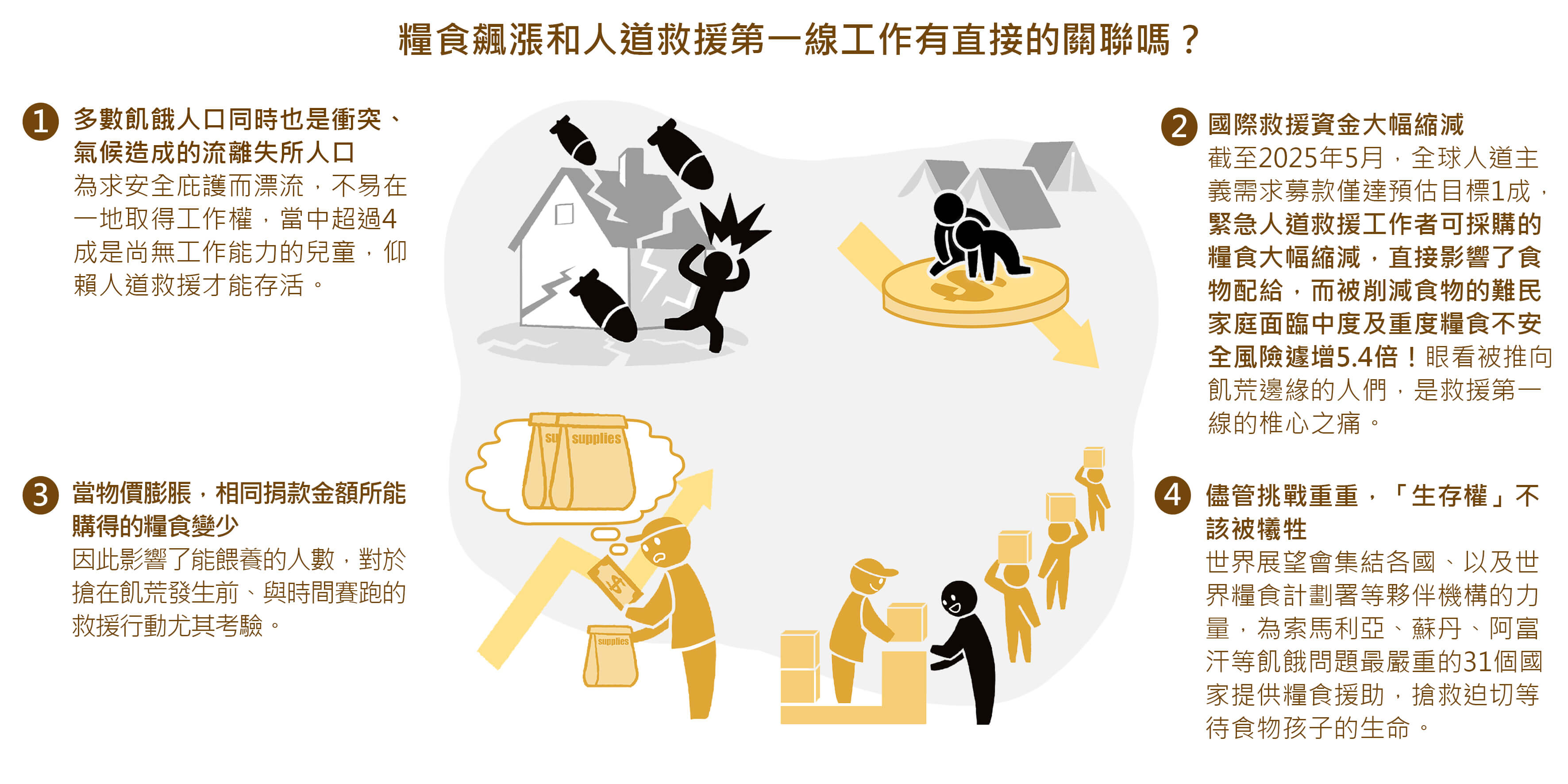 世界展望會長年與聯合國合作,連年在服務國家追蹤糧食價格。2025年發布《糧食價格波動調查》觀察到,全世界多國通膨與糧價持續上升,尤以飽受戰火、氣候災害、疫情衝擊的80國最為明顯,這份調查突顯了發展中國家人缺乏糧食所面臨的生存脆弱性。